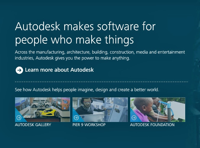 Every one of our experiences should tell our story: the future of making things. The most obvious way is to use our logo and tagline: Make anything. But our story is also embodied in all our design elements that, when used consistently, say this is Autodesk.